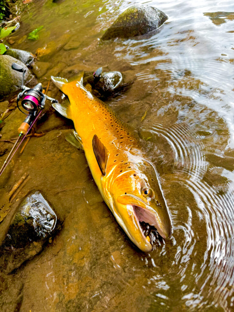 一般的にブラウントラウトは警戒心が強いと言われているため、小規模河川では慎重なアプローチが必要です。